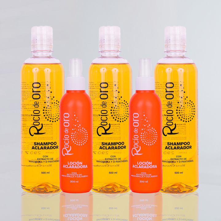 Rubio perfecto, sin tinturas y sin maltratar tu cabello -- Mega combo aclarador rocío de oro incluye 3 shampoo Rocío de Oro x 500 ml c/u. 2 Lociones Aclaradoras Rocío de Oro 150...