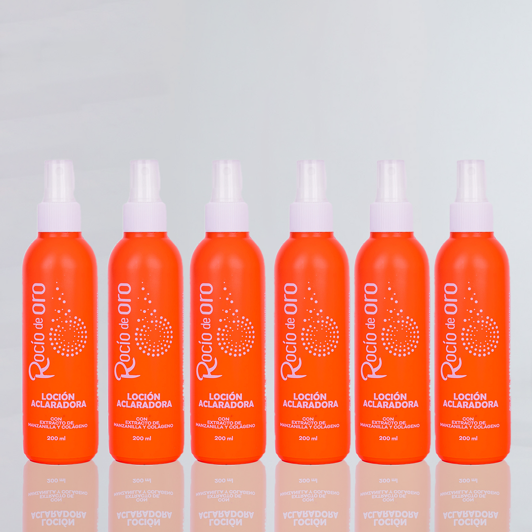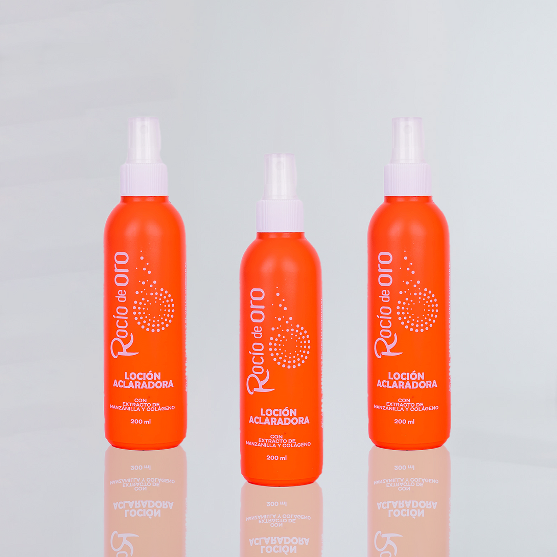 En este pequeño envase, Loción aclaradora Rocío de Oro, brinda un brillo progresivamente impecable y un color dorado dando un toque de glamour a tus vellos.