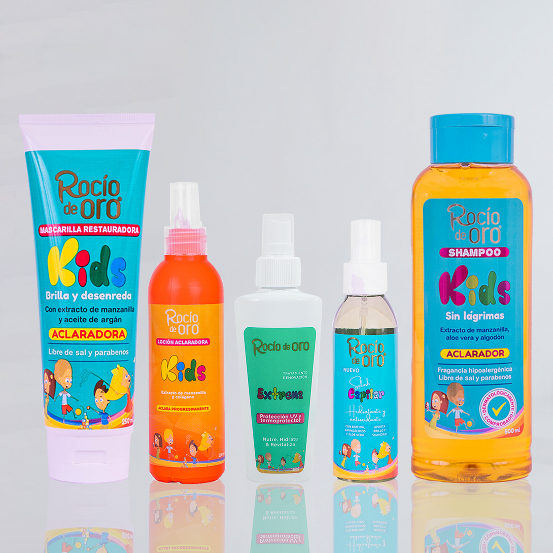 ¡Cabello rubio sin tinturas! Aclara, restaura y mantiene por más tiempo el color del pelo rubio natural de tus hijos sin maltratarlo. Incluye: 1 Shampoo Kids manzanilla x 500 ml 1 Mascarilla restauradora Kids x 250 ml 1 Splash Capilar Kids x120 ml 1 Tratamiento Termo Protector Renovación Extrema Kids Líquido x...