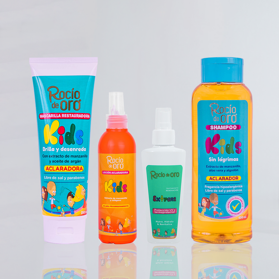 ¡Cabello rubio sin tinturas! Aclara, restaura y mantiene por más tiempo el color del pelo rubio natural de tus hijos sin maltratarlo. Incluye: 1 Shampoo Kids manzanilla x 500 ml 1 Mascarilla restauradora Kids x 250 ml 1 Tratamiento Termo Protector Renovación Extrema Kids Líquido x 120 ml 1 Loción aclaradora Kids...