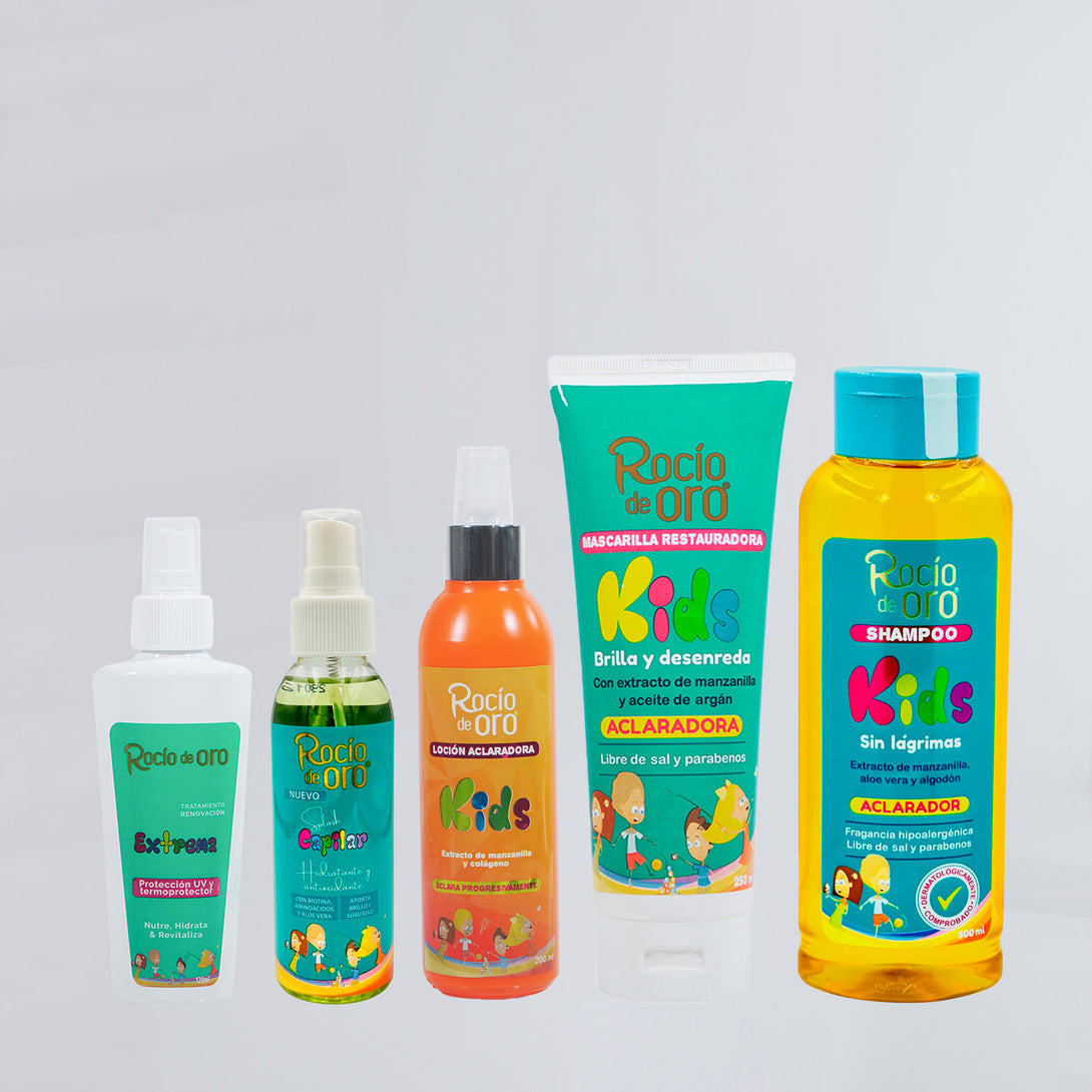 ¡Cabello rubio sin tinturas! Aclara, restaura y mantiene por más tiempo el color del pelo rubio natural de tus hijos sin maltratarlo. Incluye: 1 Shampoo Kids manzanilla x 500 ml 1 Mascarilla restauradora Kids x 250 ml 1 Splash Capilar Kids x120 ml 1 Tratamiento Termo Protector Renovación Extrema Kids Líquido x...